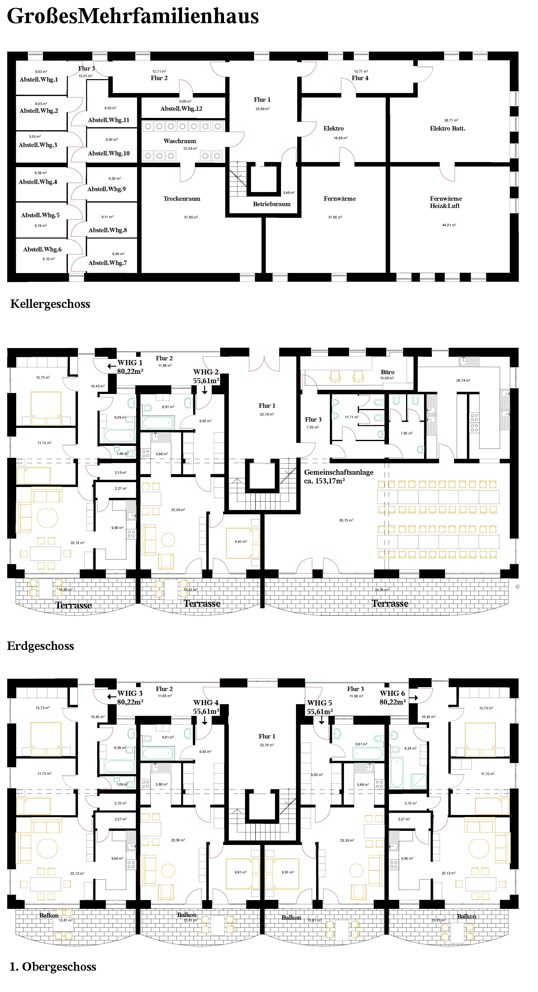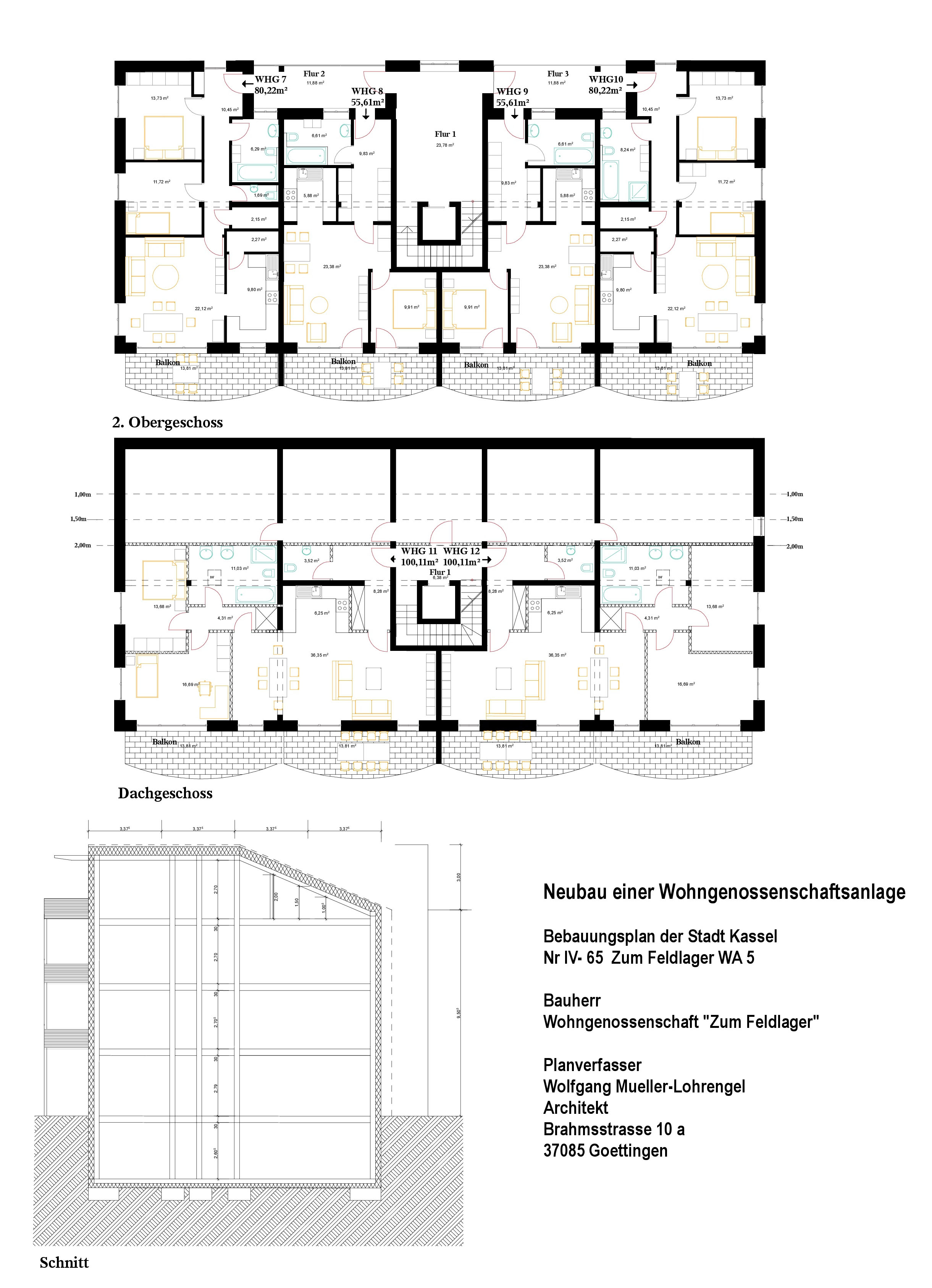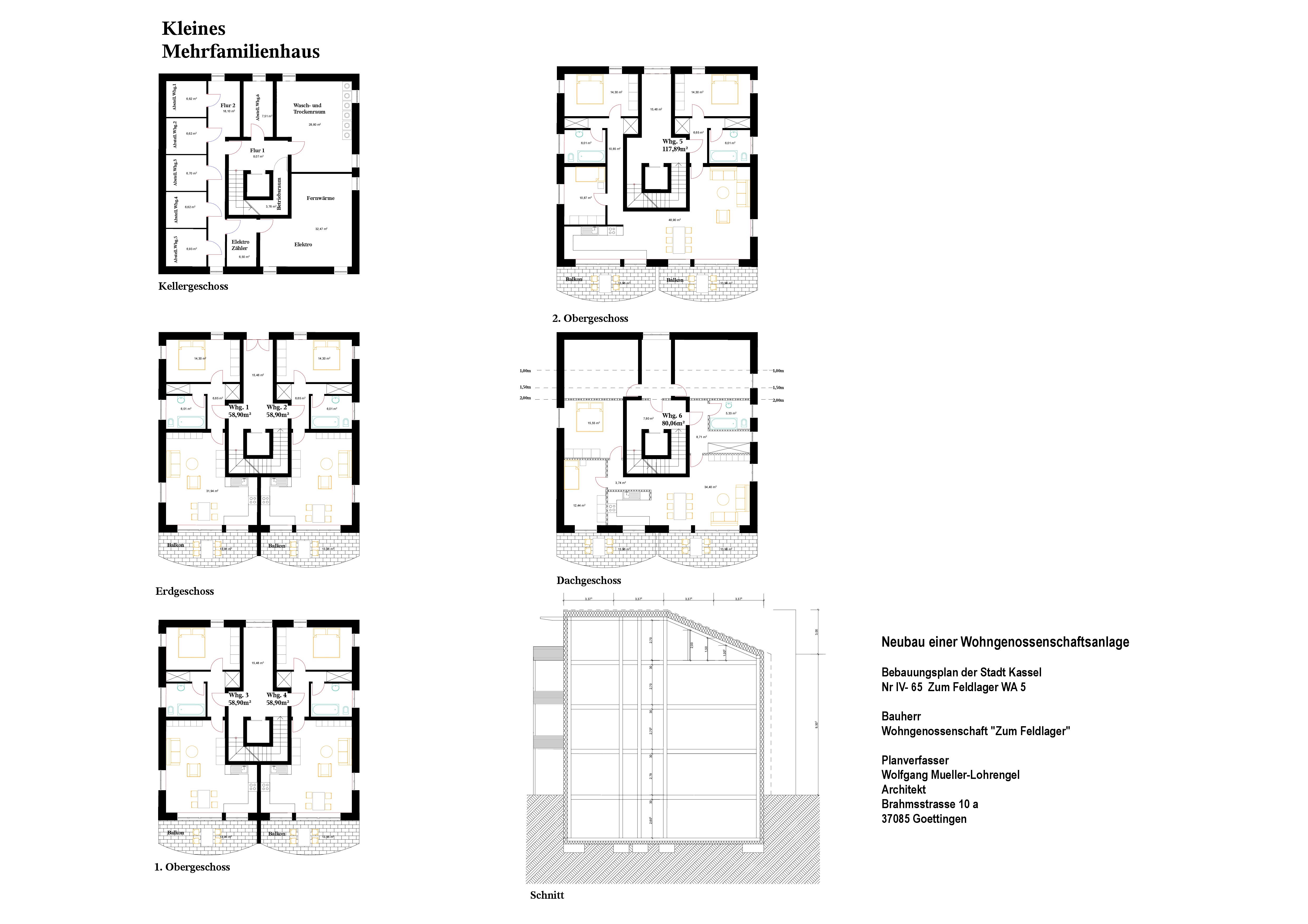 Wohn-Nutz-Verkehrsflächen(DIN 277) _________________________________________________________________________ Bauvorhaben :Errichtung eines Mehrfamilienhaus(Mehrgenerationenhaus) _________________________________________________________________________ Zweckbestimmung :Wohnen _________________________________________________________________________ Grundstück, Lage:Gemeinde Kassel, Zum Feldlager Größe:m² _________________________________________________________________________ Bauherr :Wohngenossenschaft „Zum Feldlager“ Planverfasser :Wolfgang Müller-Lohrengel,Architekt, Brahmsstr. 10a, 37085 Göttingen _________________________________________________________________________ Nutzfläche Großes Mehrfamilienhaus Kellergeschoss: Abstellräume Whg. 1 6,03 m² Whg. 2 6,03 m² Whg. 3 5,55 m² Whg. 4 6,09 m² Whg. 5 6,19 m² Whg. 6 6,10 m² Whg. 7 6,00 m² Whg. 8 6,11 m² Whg. 9 6,00 m² Whg. 10 6,00 m² Whg. 11 6,50 m² Whg. 12 6,06 m² ________________________________________ Abstellräume 72,36m² Waschraum 12,34m² Trockenraum 37,90m² Betriebsraum (Fahrstuhl) 3,48m² Fernwärmeraum 37,90m² Fernwärme/Heizung 44,01m² Elektroraum (Zähler) 18,88m² Elektroraum (Batterie) 38,71m² ________________________________________ Nutzfläche KG Gesamt 265,50m² Verkehrsfläche Flur 1 23,69m² Flur 2 12,71m² Flur 3 23,69m² Flur 4 12,71m² _____________________________________ Verkehrsfläche KG Gesamt 64,12m² 1. Wohn-Nutz-Verkehrsflächen(DIN 277) Großes Mehrfamilienhaus Wohnfläche Großes Mehrfamilienhaus Erdgeschoss: Wohnfläche Terrasse/Balkon 25% Whg. 1 80,22m² 3,45m² Whg. 2 55,61m² 3,45m² Gemeinschaftsfläche 153,17m² 7,44m² ____________________________________________________________ Wohnfläche EG 289,00m² 14,34m² Wohnfläche EG Gesamt 303,34m² Verkehrsfläche Flur 1 23,78m² Flur 2 11,88m² _____________________________________ Verkehrsfläche EG Gesamt 35,58m² 1. Obergeschoss: Wohnfläche Terrasse/Balkon 25% Whg. 1 80,22m² 3,45m² Whg. 2 55,61m² 3,45m² Whg. 3 55,61m² 3,45m² Whg. 1 80,22m² 3,45m² _______________________________________________________________ Wohnfläche 1.OG 271,66m² 13,80m² Wohnfläche 1.OG Gesamt 285,46m² Verkehrsfläche Flur 1 23,78m² Flur 2 11,88m² Flur 3 11,88m² _____________________________________ Verkehrsfläche 1.OG Gesamt 47,54m² 2. Obergeschoss: Wohnfläche Terrasse/Balkon 25% Whg. 1 80,22m² 3,45m² Whg. 2 55,61m² 3,45m² Whg. 3 55,61m² 3,45m² Whg. 1 80,22m² 3,45m² _______________________________________________________________ Wohnfläche 2.OG 271,66m² 13,80m² Wohnfläche 2.OG Gesamt 285,46m² Verkehrsfläche Flur 1 23,78m² Flur 2 11,88m² Flur 3 11,88m² _____________________________________ Verkehrsfläche 2.OG Gesamt 47,54m² 2. Wohn-Nutz-Verkehrsflächen(DIN 277) Großes Mehrfamilienhaus Dachgeschoss: Wohnfläche Terrasse/Balkon 25% Whg. 1 101,12m² 6,90m² Whg. 2 101,12m² 6,90m² _______________________________________________________________ Wohnfläche DG 202,24m² 13,80m² Wohnfläche DG Gesamt 216,04m² Verkehrsfläche Flur 1 6,38m² _____________________________________ Verkehrsfläche DG Gesamt 6,38m² Zusammenfassung Großes Mehrfamilienhaus Wohnflächen EG 303,34m² 1.OG 285,46m² 2.OG 285,46m² DG 216,04m² ______________________________________ Wohnfläche Gesamt 1.090,30m² Nutzflächen KG 265,50m² Wohnfläche Gesamt 1.090,30m² ______________________________________ Nutzflächen Gesamt 1.355,80m² Verkehrsflächen KG 64,12m² EG 35,58m² 1.OG 47,54m² 2.OG 47,54m² DG 6,38m² ______________________________________ Verkehrsflächen Gesamt 171,16m² 3.